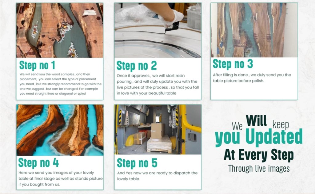 NATURAL WOOD FINISH - Carefully designed and hand crafted by artists. Classy chosen colors and shades of polish to enhance the richness of table, Natural wood finish with processed eastern wood to have long lasting grandeur look. We use only the highest quality of hardwoods and Epoxy Resin materials in our work and believe only in perfection.